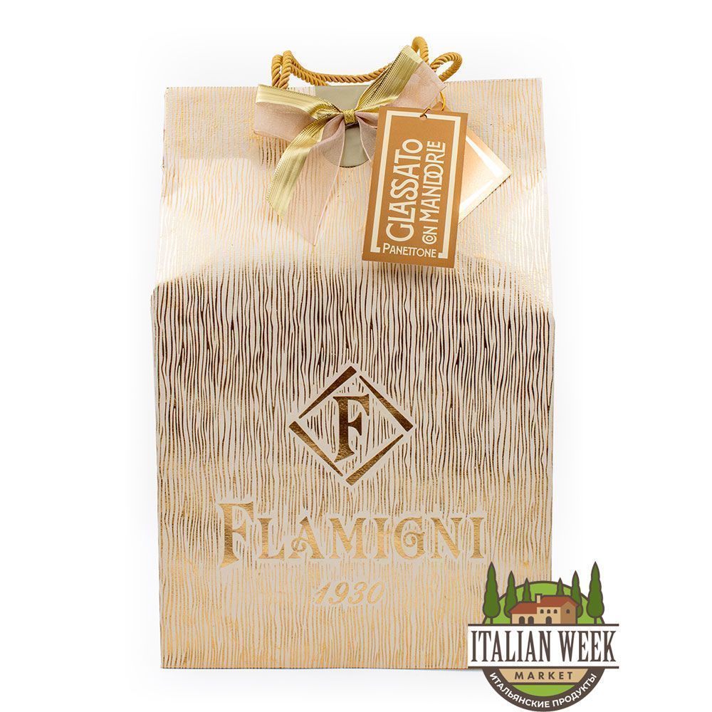 Панеттоне «Глазированный с миндалем» от Flamigni готовится по столетнему пьемонтскому рецепту, который предполагает низкую форму и хрупкую глазурь, покрытую обильным количеством миндаля.