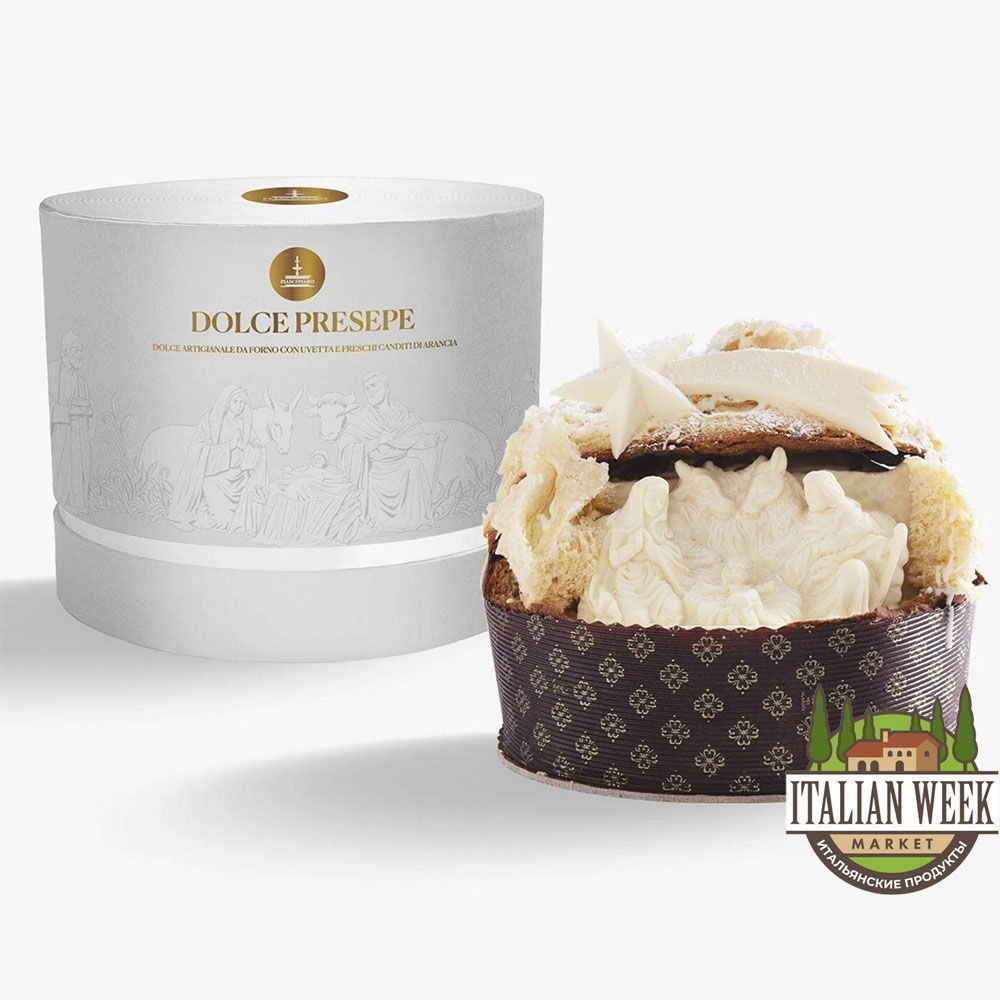 Панеттоне со свежими апельсиновыми цукатами и изюмом со вкусом марсалы и зибиббо, украшенный Рождественским вертепом, сделанным вручную из белого шоколада и нуги. Упакован вручную в изысканную шляпную коробку. Настоящий шедевр!