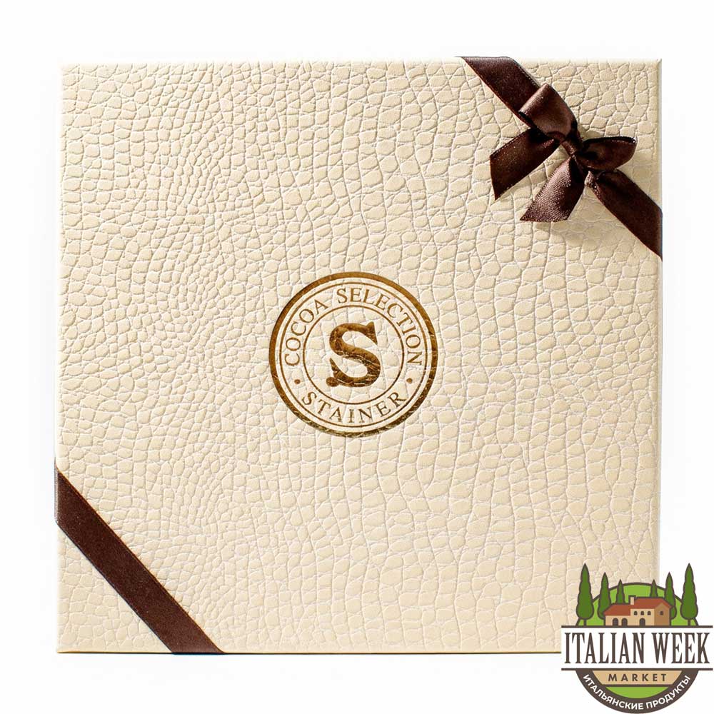 Состав: сахар, какао паста, какао масло, молоко цельное сухое и сливки молочные сухие, масла растительные (пальмовое, подсолнечное), грецкий орех, какао-порошок, фисташки, миндаль, кофейный порошок, лактоза, лимонная и мандариновая экссенция, эмульгатор: подсолнечный и соевый лецитин, зерна какао, регулятор кислотности: лимонная кислота, ароматизаторы: малина, сабайон, грецкий орех, миндаль, ром. Красители: карминовая пудра (Е120), свекольная пудра, турмериковая пудра (Е100), желтый гилро сафлор, зеленый краситель (Е133). Может содержать остатки других орехов и арахиса.